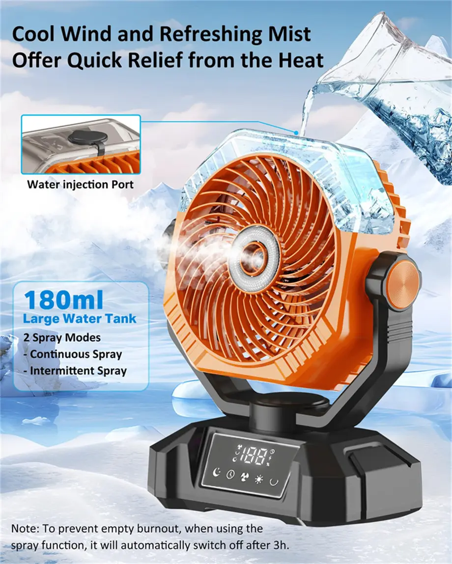 This portable camping fan offers powerful, quiet performance with 3 adjustable speeds for effective cooling. Ideal for camping, picnics, and hiking, it features a water tank with 3 mist levels for a customized cooling experience. The fan also includes soft LED lighting and vibrant RGB colors, adding ambient light for nighttime use and outdoor events. Perfect for staying comfortable and refreshed on the go.
