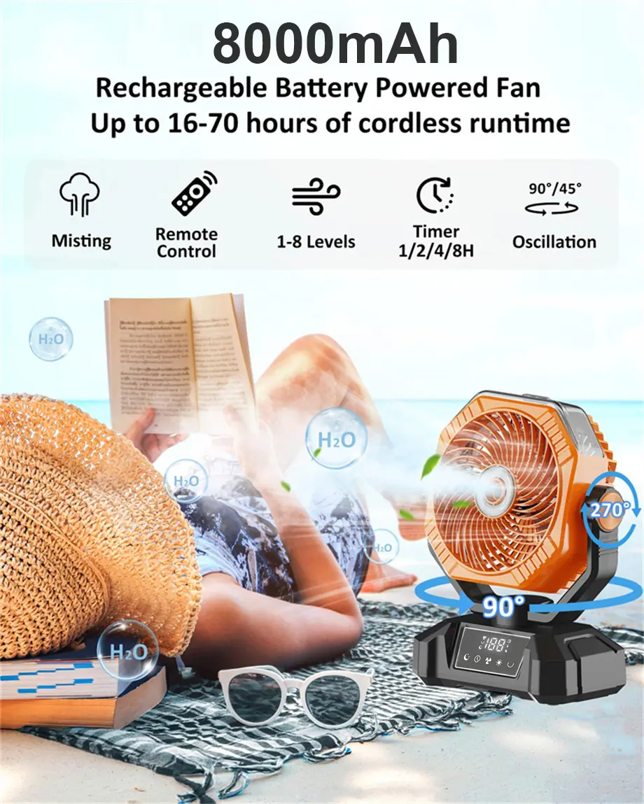 Compact, battery-powered fan with cooling, misting, oscillation, timer, LED lights, and emergency power – perfect for travel, camping, or home use.