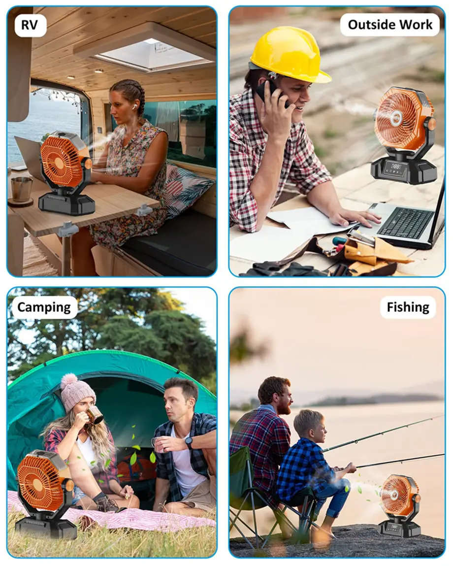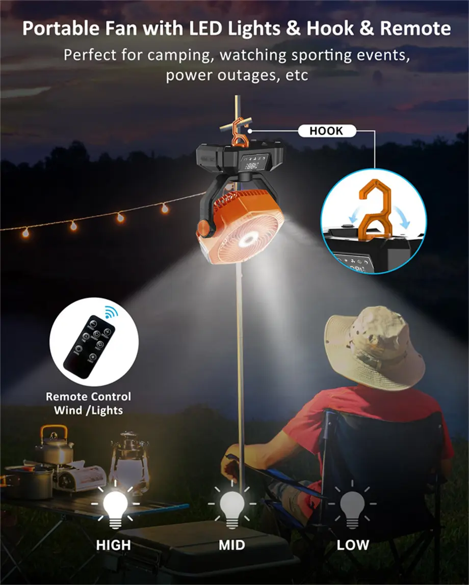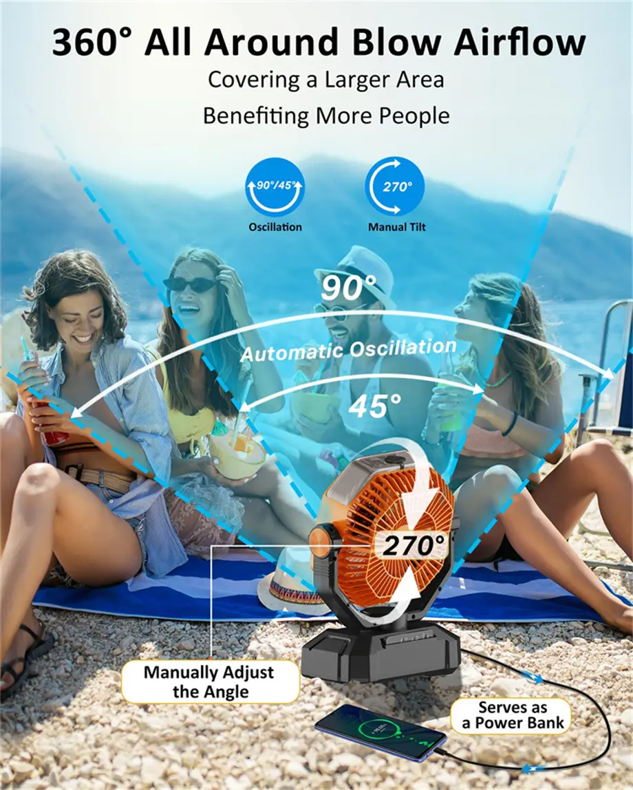 With 45° and 90° oscillation, it's perfect for outdoor activities. The hook design makes it easy to hang from tents or umbrellas.